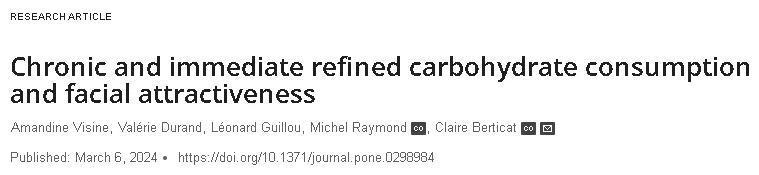 ①Visine A, Durand V, Guillou L, Raymond M, Berticat C (2024) Chronic and immediate refined carbohydrate consumption and facial attractiveness. PLoS ONE 19(3): e0298984. https://doi.org/10.1371/journal.pone.0298984