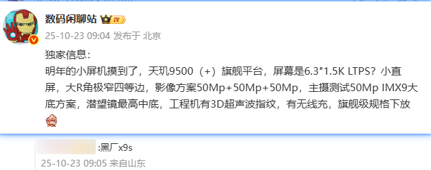 【CNMO科技消息】10月23日,有数码博主曝光了一款小屏手机的配置信息。该博主称,这款手机搭载天玑9500+处理器,并将于明年发布。有网友猜测求股票配资,这款手机是OPPO新款小屏旗舰手机Find X9s。